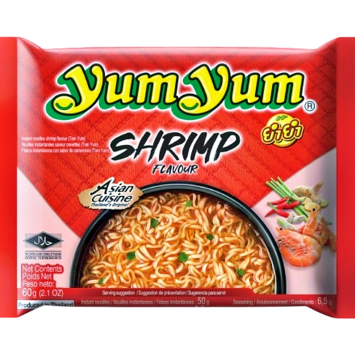 Yum YumYum Yum Instant Noodles - Shrimp 60gm are quick-cooking noodles with a savory shrimp-flavored seasoning. Perfect for a fast and satisfying meal, th...