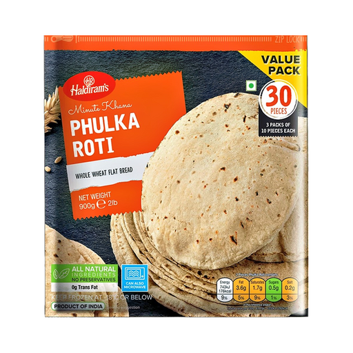 Frozen Haldiram’s Phulka Roti (30pcs, 900gm) offers soft, homemade-style Indian flatbreads that are convenient and ready in minutes. Made from whol...